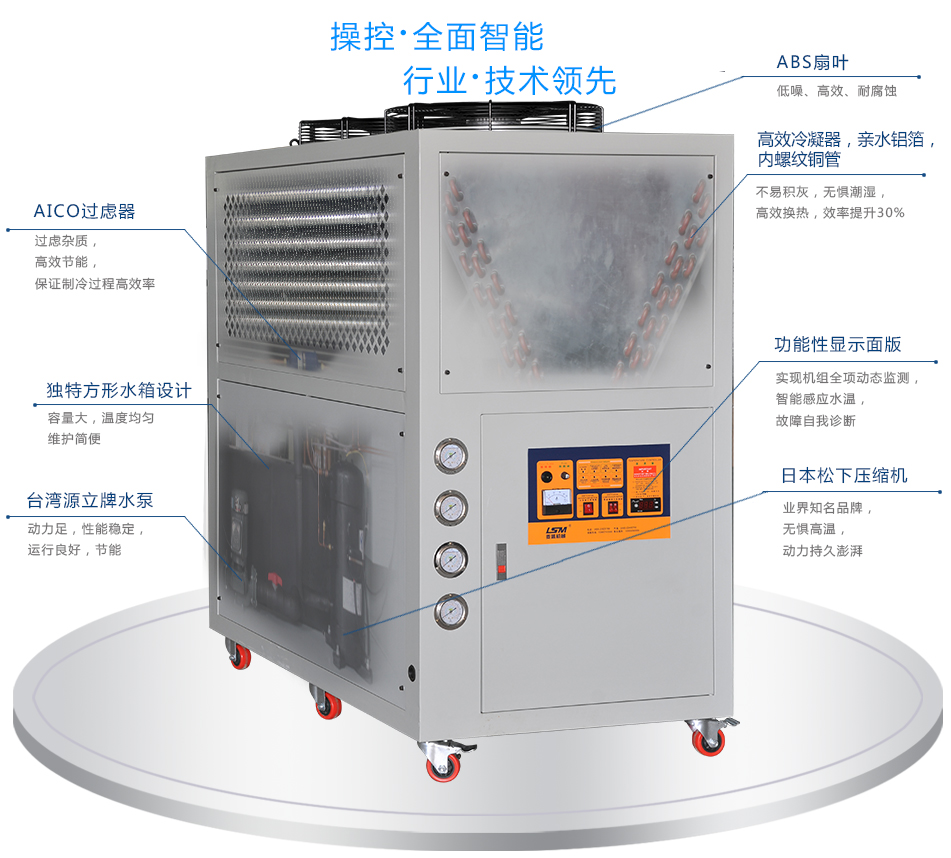 開放式冷水機(jī)精選公司開發(fā)出的高智能PLC、PC級電腦控制系統(tǒng),可做遠(yuǎn)程監(jiān)視與控制,具有自動(dòng)加卸載、定時(shí)開關(guān)機(jī)以及記錄故障原因等多重功能;操作簡單,主機(jī)與電源接駁。故障率低,安全系數(shù)高,安裝簡單,系統(tǒng)控制可即時(shí)調(diào)整,直觀可靠。